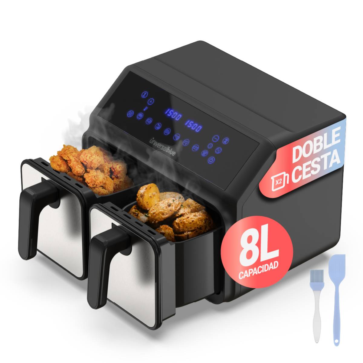 - Freidora de aire doble sin aceite con 4+4L de capacidad, control digital, 8 menús automáticos y cestas independientes.